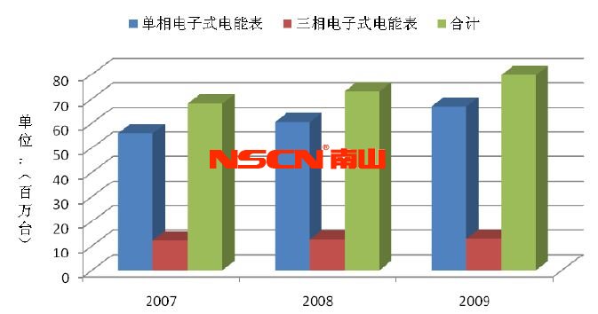 2007-2009年我國電 子式電能表產(chǎn)量分別為6,809.36萬臺、7,297.73萬臺、7,974.99萬臺,2008年同比增長7.17%,2009年同比增長 9.28%,其中,單相電子式電能表2008年同比增長8.09%,2009年同比增長10.76%,電子式電能表市場需求總體呈現(xiàn)持續(xù)增長的良好態(tài)勢。