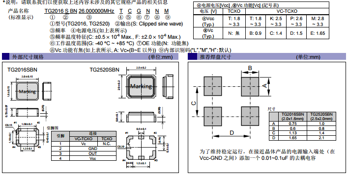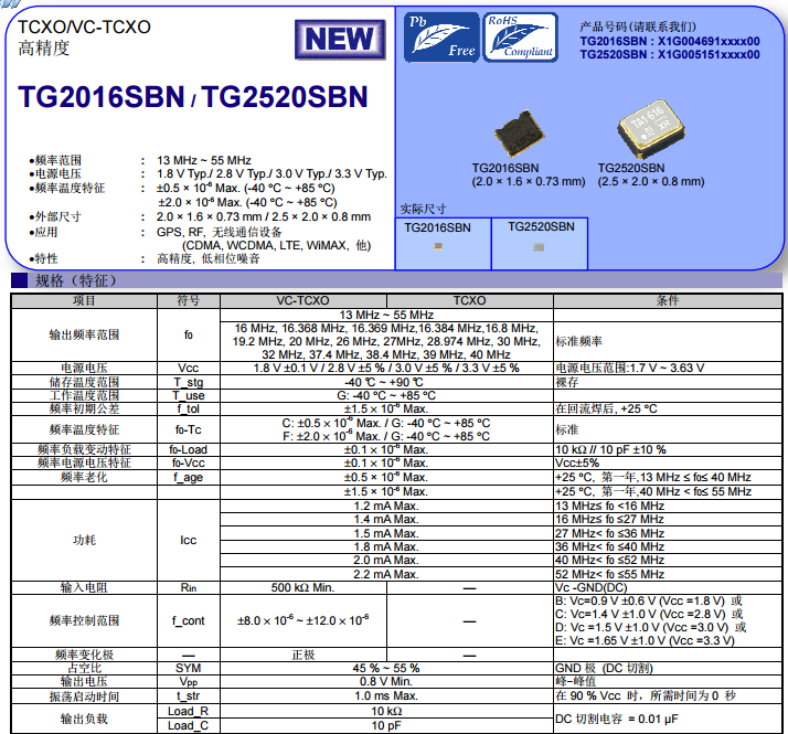 TG2016SBN,38.4MHz滿足市場(chǎng)對(duì)于小型化的需求.并且提供電源電壓1.8V-3.3V,低消耗電流。X1G004691013600,38.4MHz此款2016溫補(bǔ)晶振儲(chǔ)存溫度在-40°C to +90°C,工作溫度范圍在-40°C to +85°C。振蕩啟動(dòng)時(shí)間只需1.0 ms Max.即可實(shí)現(xiàn)。X1G004691013600這種低電壓、高精度TG2016SBN溫補(bǔ)晶體振蕩器是小型化高端智能產(chǎn)品的福音,在市場(chǎng)上廣受歡迎。淡然除了TG2016SBN X1G004691013600 還有很多其他頻點(diǎn)很受歡迎:16MHz , 16.384MHz,19.2MHz,20MHz , 26MHz , 27MHz , 28.974MHz , 30MHz , 32MHz , 37.4MHz , 39MHz , 40MHz,頻率變化為正極。下面南山電子就給大家提供TG2016SBN的規(guī)格書以供大家選型參考