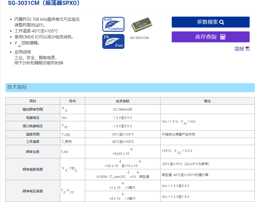 今天給大家介紹愛普生新推出的一款低壓且有固定頻率的晶振SG-3031CM。SG-3031CM是一款32.768K有源晶振,大家都知道32.768kHz一般無源晶振較多,而SG-3031CM類似于SG-3030CM,同屬于32.768K有源晶振,工作溫度寬至-40°C至+105°C。SG-3031CM兼容CMOS芯片技術(shù),具有優(yōu)化的CMOS IC設(shè)計,最大0.65uA的低功耗,可以有效減少電流消耗。內(nèi)置的32.768 kHz晶體單元可實現(xiàn)無調(diào)整的高效運行。電源電壓范圍從1.2V至5.5V,這也是SG-3031CM一個特點,相比于3030CM,SG-3031CM可以在更低的電壓下運行,SG-3031CM晶體振蕩器,采用標(biāo)準(zhǔn)3215小尺寸封裝,四個焊接腳位,SG-3031CM可以應(yīng)用于工業(yè),安全,智能電表,用于計時和睡眠功能的時鐘。下面南山電子就給大家分享最新SG-3031CM中文規(guī)格書,以便大家選型參考: