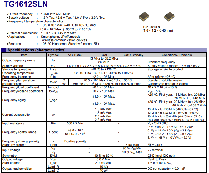 溫度補(bǔ)償晶體振蕩器TG1612SLN使用愛(ài)普生開(kāi)發(fā)和制造的IC和MHz基本型晶體,可在105℃溫度環(huán)境下工作并具有待機(jī)功能。結(jié)合小尺寸,高度低、壓力和模制密封阻力的單密封結(jié)構(gòu)的優(yōu)勢(shì),TG1612SLN物聯(lián)網(wǎng)和工業(yè)應(yīng)用的很好選擇。TG1612SLN頻率范圍:13MHz至55.2MHz,輸出方式:削頂正弦波,供電電壓:1.7 V至3.63 V(1.8 V ±0.1 V / 2.8 V ±5 % / 3.0 V ±5 % / 3.3 V ±5%)工作溫度:-40℃至+105℃。并且TG1612SLN可以兼容ST,支持高標(biāo)準(zhǔn)要求的產(chǎn)品設(shè)計(jì),下面南山電子就給大家分享下TG1612SLN規(guī)格書(shū),以供大家選型參考: