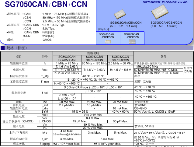 大家好,近期很多客戶詢問一款50MHz晶振SG7050CAN,50MHz,TJGA,X1G004481001200。50MHz晶振是應(yīng)用比較廣泛的一種頻率,其實(shí)常用的50MHz晶振大部分是50MHz有源晶振,可以用于銀行金融系統(tǒng),稅控系統(tǒng),遠(yuǎn)程抄表系統(tǒng),加密狗,測(cè)試儀器,超聲頻,網(wǎng)絡(luò)傳輸ADSL,安防(攝像頭,報(bào)警器)等,當(dāng)然熱門的還有比如溫補(bǔ)類型50MHz晶振TG5006CG 50MHz,南山電子給大家分享下50MHz晶振:SG7050CAN,50MHz,TJGA,X1G004481001200的規(guī)格書以供大家選型參考: