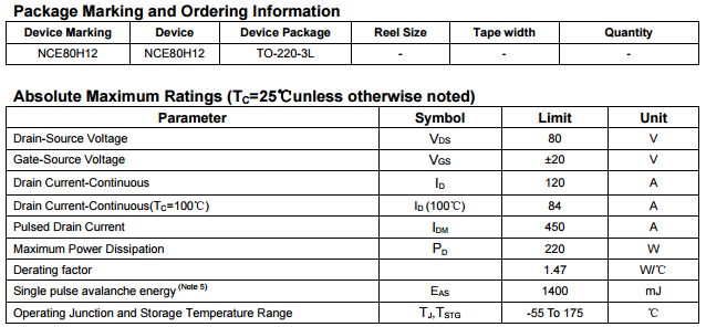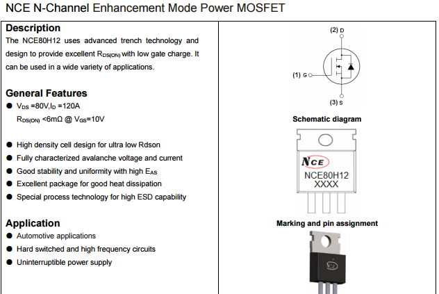 作為驅動部分的開關管,MOS管的主要被關注點是耐壓,耐流值以及開關速度。MOS管是電壓驅動型器件,只要柵極G和源級S間給一個適當電壓,源級S和D間導電通路就形成。這個電流通路的電阻被成為MOS管內阻,也就是導通電阻。這個內阻大小基本決定了MOS管芯片能承受的多大導通電流(當然和其它因素有關,如熱阻)。內阻越小承受電流越大(因為發(fā)熱小)。針對這種需求,新潔能生產出內阻小,抗過電流能力好的N溝道溝槽工藝MOS管——NCE80H12,NCE80H12的導通電阻小于6mΩ,輸出電流可達120A,電機扭矩較好,下面南山電子就來給大家分享下NCE80H12的規(guī)格書,大家可以對照其他參數來選型參考:
