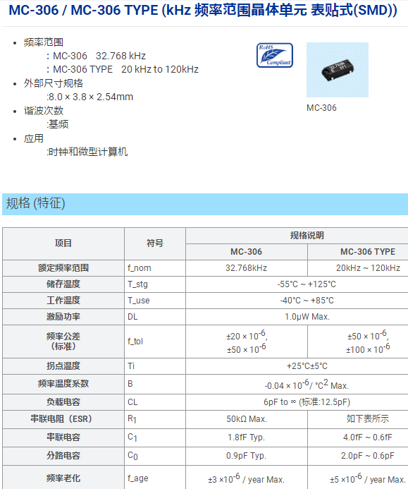 用于時鐘和微型計(jì)算機(jī)的8038無源晶振:MC-306