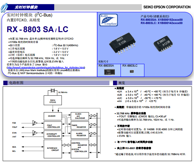 愛普生時鐘芯片模塊RX-8803SA,是一款通用型實時時鐘模塊,內置DTCXO,均有高精度穩(wěn)定性,DTCXO也就是我們常說的數(shù)字溫補晶振,RX-8803SA在使用數(shù)字式TCXO進行頻率補償后獲得了出色的頻率精度,并擁有高精度、高穩(wěn)定和低耗電的特點。而溫度補償可以用在安裝車輛,戶外和其他系統(tǒng)暴露于極端環(huán)境溫度的環(huán)境中的設備中,也需要對時間和日期信息進行高精度跟蹤。RX-8803SA規(guī)格上可以分為: