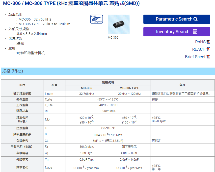 今天來介紹下無源晶振MC-306,晶體諧振器MC-306,屬于愛普生無源晶振,表晶32.768K,MC-306同時也提供20kHz~120kHz范圍內(nèi)的頻率定制。相較于MC-146,MC-306尺寸略大。在32768hz工作頻率下具有較小的串聯(lián)電阻(20kΩ Max.)。MC-306常用的負載電容MC-306 6pF,9pF,12.5pF等等。MC-306廣泛應(yīng)用于小型便攜式通信設(shè)備,時鐘和微型計算機如手機、GPS模塊、FM調(diào)諧模塊、PHS、PDA、數(shù)碼相機、、Zigbee、血糖值測量儀、信用卡結(jié)算機、各種微機的預(yù)備 時鐘、無繩電話、移動設(shè)備、電表等儀器設(shè)備等。下面南山電子給大家詳細的介紹下愛普生MC-306同系列晶振型號:
