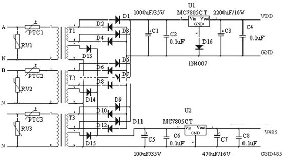 變壓器對各相的電壓進行變壓,然后通過整流穩(wěn)壓電路對電表供電。