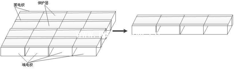 將每條產(chǎn)品兩側(cè)的端電極涂上銀漿,使面電極與背電極得以導(dǎo)通。(此處也可用濺射的方法)